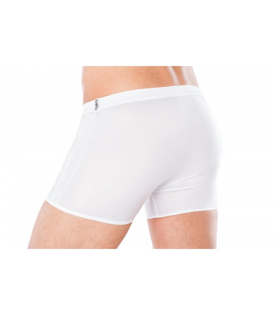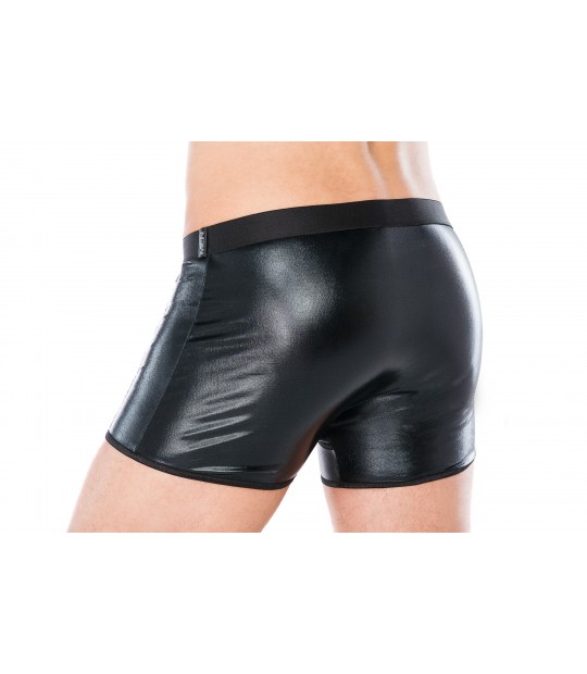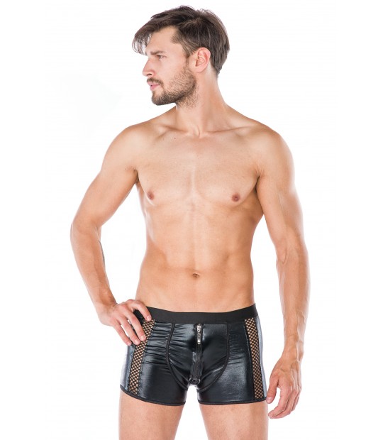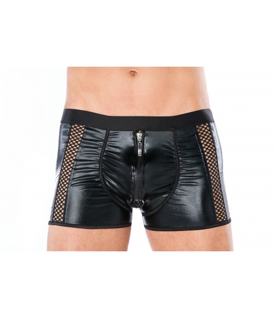 Erotyczne bokserki z tkaniny wet look ozdobione kabaretką z przodu modelu i zamkiem błyskawicznym.