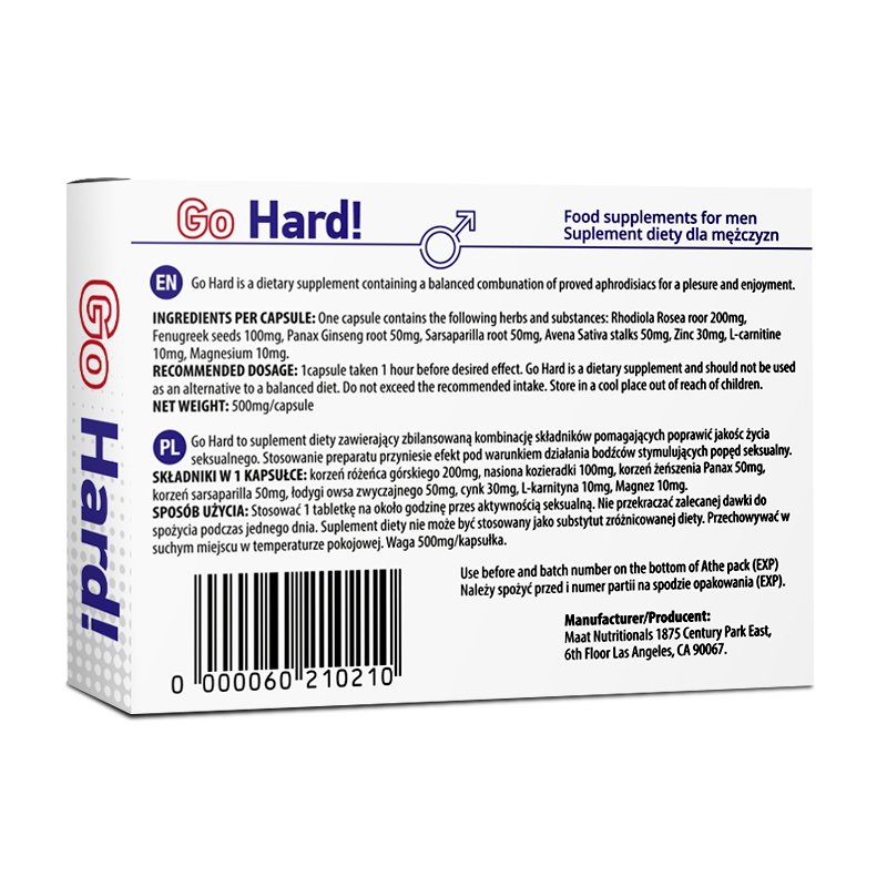 Składniki zawarte w GoHard™ to znane od wieków ziołowe składniki, które zwiększają poziom libido i przywracają siły witalne. GoHard™ przyczynia się do łatwiejszych i szybszych erekcji w niedługim czasie od spożycia. Efekt ten utrzymuje się przez kilka godzin.Pomaga mężczyznom w sposób zdumiewający odzyskać satysfakcję we współżyciu seksualnym.