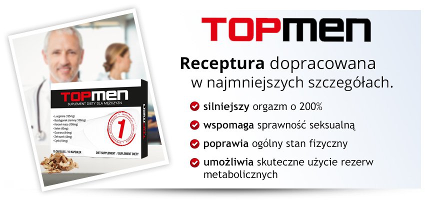 TopMen™ jest najnowszym produktem na polskim rynku suplementów diety na erekcję. Wieloletnia praca zespołu marketingowego sprawiła, że jego formuła została dopracowana w najmniejszych szczegółach. Jest niezwykle skuteczny zapewniając przy tym maksimum bezpieczeństwa, ponieważ został stworzony tylko z w pełni naturalnych składników.
