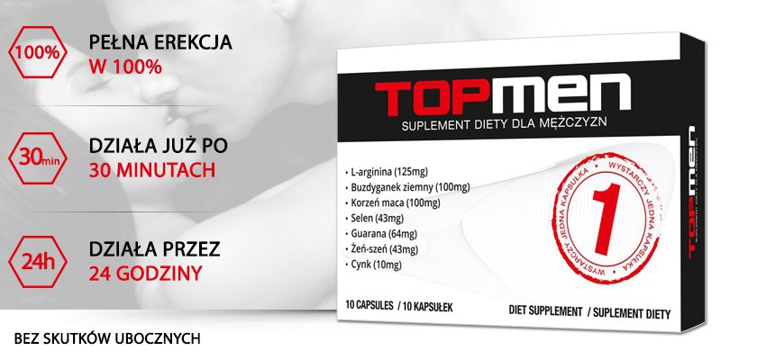 TopMen™ to znany już suplement diety na erekcję na polskim rynku, mimo, że na rynku znajduję się krótki czas to już zyskał ogromną popularność, dzięki swojej skuteczności. Nasz produkt jest polecany przez klientów z całego świata. Przetestowały go miliony mężczyzn, z rewelacyjnym skutkiem. TopMen™ to jedyny tak skuteczny i dający natychmiastowe efekty suplement diety.